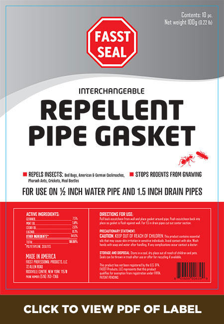 FASST Seal Water Pipe Gaskets utilize the same proven repellent technology and repellent oils formulation as FASST Door Seals. The Gaskets repel bed bugs, American and German cockroaches, ants, crickets, beetles and mice and stops rodents from gnawing.