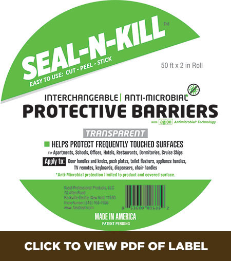 SEAL-N-KILL contains antimicrobial copper and zinc which work synergistically with patented Agion Antimicrobial technology. The metal ions are time released under the same conditions that cause microbial growth. The antibacterial, antifungal and antiviral properties of metal ions have been extensively studied. SEAL-N-KILL provides antimicrobial protection to the product and to the surfaces which it covers. It is easy to use as it can be easily cut, peeled and applied to frequently touched surfaces such as push plates, door handles, appliance handles, toilet flushers, chair rails, eating trays and bed railings to name a few. The non-scratch acrylic finish is easy to clean. SEAL-N-KILL retains is antimicrobial properties for at least a year and the specially designed adhesive enables removal while remaining firmly stuck onto the application surface. It is the perfect solution to protect frequently touched surfaces in apartments, schools, medical facilities, offices, hotels, dormitories and cruise ships.